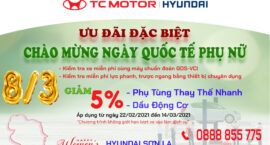 Hyundai Sơn La “Công ty TNHH Ôtô Hà Hường” xin trân trọng thông báo Chương trình “ƯU ĐÃI ĐẶC BIỆT – CHÀO MỪNG NGÀY QUỐC TẾ PHỤ NỮ 8/3” Chương trình không giới hạn lượt xe vào làm dịch vụ. Nhằm đem đến cho Quý khách hàng nhiều sự lựa chọn hơn để chăm sóc, […]